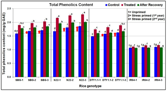 Diagrammatic representation of the effect of drought stress on total phenolics content in leaves of different rice genotypes. The upward arrow (↑) shows increased total phenolics content in leaves under control conditions in the stress-primed plants of the drought-tolerant genotypes. SBG = Sahbhagidhan 1, N22 = Nagina-22, DTY1.1 = a Near Isogenic Line of IR64 harboring qDTY1.1, drought-tolerant genotypes; IR64, drought-sensitive genotype. Data present the mean value (n = 3). Means followed by different lower-case letters are significantly different (p < 0.05). The error bar represents the standard deviation (±SD).