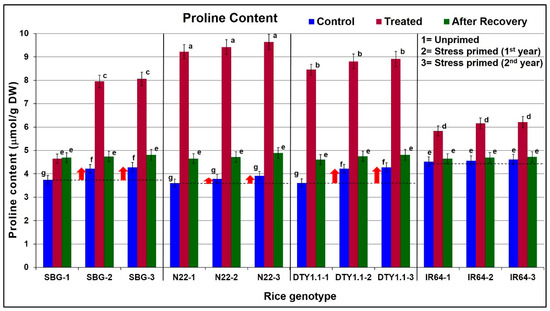 Diagrammatic representation of the effect of drought stress on proline content in leaves of different rice genotypes. The upward arrow (↑) shows increased total proline content in leaves under control conditions in the stress-primed plants of the drought-tolerant genotypes. SBG = Sahbhagidhan 1, N22 = Nagina-22, DTY1.1 = a Near Isogenic Line of IR64 harboring qDTY1.1, drought-tolerant genotypes; IR64, drought-sensitive genotype. Data present the mean value (n = 3). Means followed by different lower-case letters are significantly different (p < 0.05). The error bar represents the standard deviation (±SD).