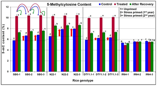 A part (~25%) of the increased methylation level was retained even after the withdrawal of the stress in the drought-tolerant genotypes, with a maximum in the case of N22, particularly in the first year of stress imposition (Figure 7). However, a clear difference in the modulation of 5-mC content between N22 and its near-isogenic line (DTY1.1) was observed. Although the increase in 5-mC content on drought stress imposition was the same, the amount of increased 5-mC retained after recovery, as well as the increased 5-mC content in the subsequent generation under control, was comparatively lower in DTY1.1.