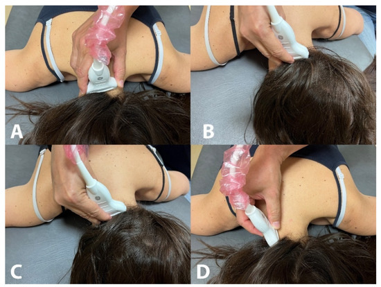 Placement of the ultrasound probe for the assessment of the rectus capitis posterior minor (A), rectus capitis posterior major (B), oblique capitis superior (C) and oblique capitis inferior (D).