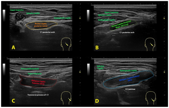 Ultrasound imaging of the rectus capitis posterior minor (A), rectus capitis posterior major (B), oblique capitis superior (C) and oblique capitis inferior (D).