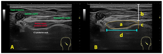 All images were codified, processed, and analyzed in the offline DICOM ImageJ software v. 1.42 (National Institutes of Health, Bethesda, MD, USA). The cross-sectional area (CSA), perimeter, depth, width, and thickness of each of the suboccipital muscles was assessed by an experienced assessor with more than 15 years in ultrasound imaging and blinded to the subject’s condition (Figure 3).
