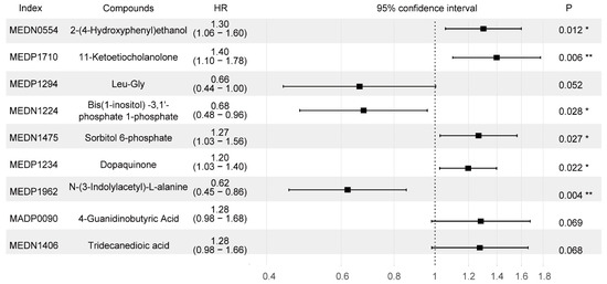 Forest plot of the nine selected metabolites related to the 5-year PFS. Index is the code of the metabolite in the Metware database. Compounds is the name of the substance corresponding to the index. HRs (95% CI) were calculated by applying a Cox regression analysis. Abbreviations: HR, hazard ratio. * indicates p < 0.05, ** indicates p < 0.01.
