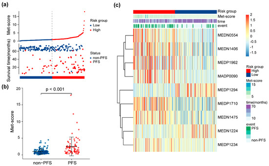 The Met score for each patient in the training set is shown in Figure 3a. Patients were stratified into high- and low-risk groups based on the median Met score (cutoff = 0.92). The Met-score distribution was significantly different between the groups with and without progression (p < 0.001, Figure 3b). A heatmap of significantly different metabolites is shown in Figure 3c to facilitate understanding of the prognostic signature.