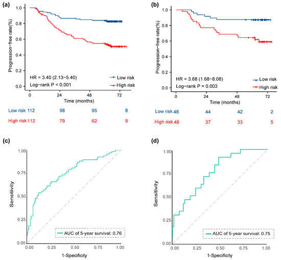 Kaplan–Meier survival curves and ROC curves for low- and high-risk groups based on the 9-metabolite signature to predict 5-year PFS. Kaplan–Meier curves for PFS stratified by the 9-metabolite signature in the training set (a) and the validation set (b). ROC curves comparing the predictive power of the 9-metabolite signature for PFS in the training set (c) and the validation set (d). Abbreviations: PFS, progression-free survival; ROC, receiver operating characteristic.