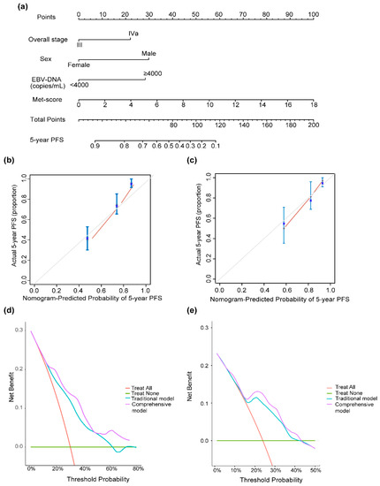 A nomogram for individualized PFS prediction was constructed using these variables (Figure 5a). Compared with the traditional prognostic model—including sex, overall stage, and pretreatment EBV-DNA—the additional combination of the Met score showed better discrimination in the training (C-index, 0.77 vs. 0.71) and validation sets (C-index, 0.72 vs. 0.67) (Table 2). The calibration curves plotted at the 5-year time points visually confirmed a good fit between the predicted nomogram-predicted PFS probability and observed PFS rates in the two sets (Figure 5b,c). DCA was used to evaluate the clinical utility of the nomogram. The DCA for the 5-year PFS nomogram showed that for a threshold probability >15%, using the comprehensive nomogram model to predict the 5-year PFS could add more benefits than the traditional model in the training set (Figure 5d), which are then identified in the validation set (Figure 5e).