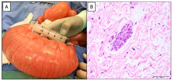 A 2-year-old patient with intestinal neuronal dysplasia type B who developed acute intestinal obstruction: (A)—intraoperative with significant distention of the rectum and sigmoid; (B)—histopathological analysis with submucosal nerve plexus with hyperganglionosis in the rectum (H&E, 400×).