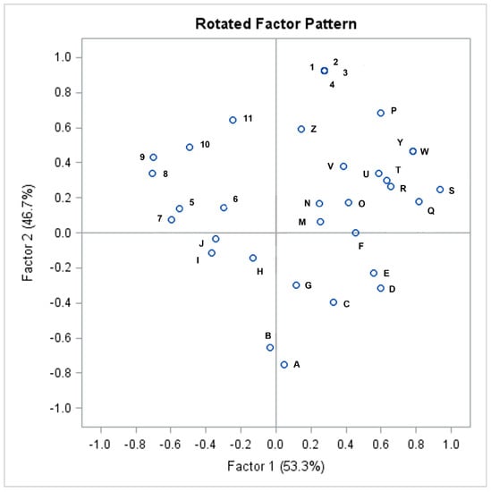 Graphic distribution of the factorial rotation process: A—Maximum number of days without bowel movement; B—Calretinin expression in heterotopic neurons in the muscularis mucosa; C—Birth weight; D—RIV C1: < 2 bowel movements per week; E—Need for bowel washouts; F—Bud-like nerve cell groups along nerve trunks; G—Small neurons; H—Maximum width of a plexus; I—Sex; J—Calretinin expression in nerve fibers in the lamina propria of the mucosa; M—Delayed meconium passage; N—Other malformations; O—RIV C6: large diameter stools that can obstruct the toilet; P—Intestinal Symptom Index (ISI); Q—Number of giant ganglia; R—Maximum number of neurons per ganglia; S—RIV C5: large fecal mass present in the rectum; T—Problems in the neonatal period; U—Rectal bleeding; V—Ganglia with signs of immaturity; W—Number of neurons in 25 ganglia; Y—Mean of neurons per ganglia; Z—Born to term; 1—RIV C3: history of episodes of fecal retention; 2—RIV C4: painful or hard bowel movements; 3—Abdominal distension; 4—Abdominal pain; 5—Number of plexus with more than 7 neurons; 6—Age of onset of symptoms; 7—Anisomorphic neurons; 8—Area of a neuron; 9—Age at diagnosis; 10—Calretinin expression in heterotopic neurons in the lamina propria; 11—RIV C2: >1 episode of fecal incontinence per week.