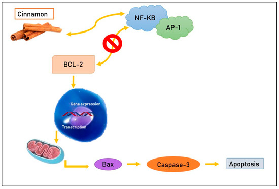 In vivo experiments [1] suggest that aqueous cinnamon extract acts on specific molecules such as the transcription factors nuclear factor kappa-light-chain-enhancer of activated B cells (NF-KB) and Activator protein 1 (AP-1), which have a crucial role in cell survival and in the regulation of the cell cycle and apoptosis. In fact, NF-KB and AP-1 have as a target the anti-apoptotic protein Bcl-2 [16] and, normally, cause an increase in this molecule with the consequent inhibition of programmed death of tumor cells [17]. Cinnamon compounds tie to NF-KB and AP-1, determining a decrease in the correspondent RNA expression and translation and preventing the anti-apoptotic action of Bcl-2, which they commonly stimulate [1] (Figure 1). In another in vivo study [9], mice in which melanoma cells (B16F10) were subcutaneously transplanted were divided into two subsets: in one group, animals received cinnamon extract daily at a dose of 400 μg/g of weight, and in the other group animals received phosphate-buffered saline (PBS). After thirty days of treatment, the tumor size was evaluated based on tumor weight and, interestingly, an important decrease was observed in the subset of mice that received cinnamon (tumor weight 6.2 g) compared with those that received PBS (tumor weight 12.2 g). These results show that cinnamon aqueous extract, acting on the transcription factors NF-KB and AP-1, has an important anti-cancer effect in vivo [1]. Even if aqueous cinnamon extract has not lead to morphological changes in cells 24 h from exposure, a progressive augment in apoptotic cells has been observed [18] and it seems that the apoptosis rate gradually increases depending on the time from cinnamon administration; in fact, in order to verify this condition, neoplastic cells of colorectal adenocarcinoma have been treated with this natural compound and showed a similar time-related pattern in increasing apoptosis rate. Furthermore, aqueous cinnamon extract proved to be capable of stimulating the expression of pro-apoptotic genes such as Bim and Bax [19,20,21,22,23,24,25,26].