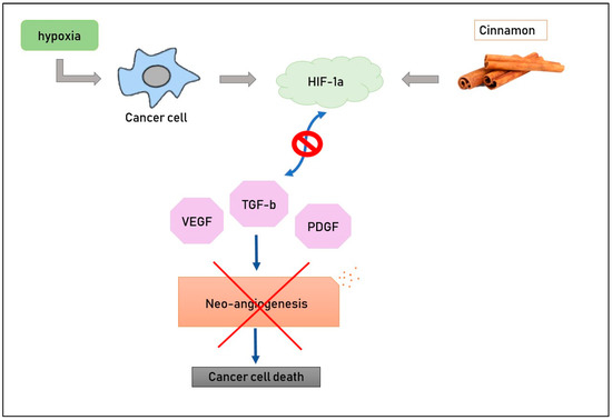The effect of aqueous cinnamon extract has been studied in a mouse melanoma model [17] in order to evaluate its possible action in inhibiting angiogenesis. It is well-known that cancer cells need more and more nutrients to grow, and these compounds come from blood, so it is crucial for tumors to have new blood vessels in their macroenvironment. Hypoxia and pro-angiogenic molecules such as vascular endothelial growth factor (VEGF), platelet-derived endothelial growth factor (PDGF) and transforming growth factor beta (TGF-b) constitute the main stimuli for neo-vascularization. Scientists treated mouse melanoma cells with cinnamon extract at various doses (0.3 or 0.5 mg/mL) and then evaluated the levels of pro-angiogenic molecules; RT-PCR and ELISA methods were used to detect the expression of VEGF, PDGF and TGF-b, and it was demonstrated that aqueous cinnamon extract inhibited these factors both in mRNA and in proteins (Figure 2). Its activity is clinically evident, too, if we pay attention to the dimensions of the spleen and lymph nodes, which are significantly smaller in mice treated with this extract than those in untreated mice [56]. HIF-1a is a transcription factor whose activity depends on tissue oxygen levels, [8,18]. In fact, hypoxia causes an increase in the presence of pro-angiogenic molecules and stimulates neo-vascularization. The administration of cinnamon extract down-regulates levels of HIF1a, conducting a reduction in the formation of new blood vessels. This evidence allows us to state that cinnamon inhibits neo-angiogenesis [56].
