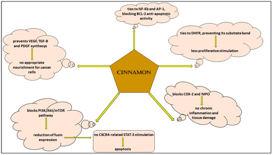 PI3K/Akt/mTOR signals, promoted by point mutations of PI3K and Akt and by inactivity of the phosphatase and tensin homolog (PTEN), play an important role in the regulation of the proliferation and apoptosis of cancer cells, especially from ovarian, gastric and breast neoplasms [44,45,46]. In detail, an irregular function of PI3K/Akt/mTOR determines an increased expression of fusin, which subsequently stimulates C-X-C chemokine receptor type 4 (CXCR-4)-related STAT3; this cascade of signals allows the maintenance of stemness in cancer cells [47]. Experiments with oral cancer cells exposed to aqueous cinnamon extract allowed the detection of an inhibitory action of the natural ingredients of this compound on cellular growth due to the fact that it down-regulates different molecules of the PI3K/Akt/mTOR pathway, preventing its activity [6]. Obviously, more and more evidence is needed before declaring that the programmed death of cells observed is due to an up-regulation of the PI3K/Akt/mTOR pathway from compounds in cinnamon extract, but the experiment cited surely represents a starting point. MAPKP-38α is a kinase activated by pro-inflammatory molecules, oxidative stress and heat shock, all mechanisms involved in tumorigenesis [48,49,50,51,52,53,54,55]. Various evidence [9] exists about the action of cinnamon compounds as a substrate for MAPKP-38α, preventing the bond of the “real” substrate and, consequently, blocking the function of this pathway, including growth and survival stimulation [6]. Other evidence comes from dihydrofolate reductase (DHFR), a protein that induces the transformation of dihydrofolate in tetrahydrofolate, which is finally the cofactor in the synthesis of different molecules fundamental in cell proliferation such as thymidylate, purines and some amino acids [15]; for this reason, DHFR has been used as a target for drugs in the treatment of various tumors, such as with methotrexate [16]. The mechanism of action for aqueous cinnamon extract is the same as that for MAPKP-38α: it ties as a substrate to DHFR, preventing the bond of its “real” substrate and, consequently, blocking its proliferative stimulation of cancer cells. This evidence could indicate a possible effect of cinnamon extract as an anti-cancer molecule due to the fact that it is capable of inhibiting the activity of MAPK-P38alfa and dihydrofolate reductase, molecules which normally have crucial roles in the proliferation and survival of neoplastic cells. In detail, aqueous cinnamon extract interacts with catalytic residues of MAPKP38α and DHFR, such as Val38 and Tyr35, for the first and with Ala9 and Tyr121 for the second, blocking or significantly modifying their function [6].
