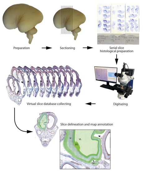 - Ding, S.L.; Royall, J.J.; Lesnar, P.; Facer, B.A.C.; Smith, K.A.; Wei, Y.; Brouner, K.; Dalley, R.A.; Dee, N.; Dolbeare, T.A.; et al. Cellular resolution anatomical and molecular atlases for prenatal human brains. J. Comp. Neurol. 2022, 530, 6–503. [Google Scholar] [CrossRef] [PubMed]