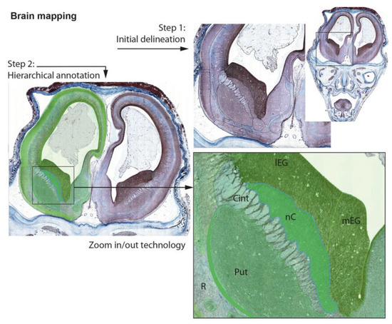 A separate task is marking and annotating virtual preparations for each developmental stage. Annotation schemes will be overlapped on the digital images of histological slides. The resulting vector graphics will be converted to Scalable Vector Graphics (SVG). Each vector area will then be associated with a certain brain structure and annotated; in this way, the collating vector allows the flexibility to create various presentation modes (e.g., with or without colorization and transparency) (Figure 3).