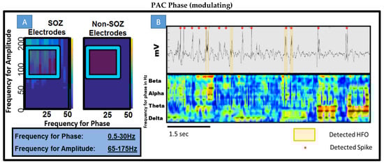 In answering the question of whether there is difference in interictal time irrespective of behavioral state between SOZ and non-SOZ electrodes, simple PACgram analysis was undertaken in every patient at random 1 min periods of time across the two-hour night data segment. As seen in Figure 3A where patient 8 is shown, there was a notable difference. The difference was not consistent across other segments within the same patient nor between patients. Of note however is the range of low frequencies modulating a range of high frequencies in the seizure onset zone electrodes. There appears, qualitatively, to be higher coupling between beta, alpha, and all ranges of gamma (low, high, and low ripple). Figure 3B shows a short segment of this 1 min period and the detected spikes, HFOs, and PAC all overlaid together. Qualitatively, one can see that spikes and HFOs have some correlation with higher PAC values but and that perhaps alpha, beta, and delta are significant low-frequency modulating bands.