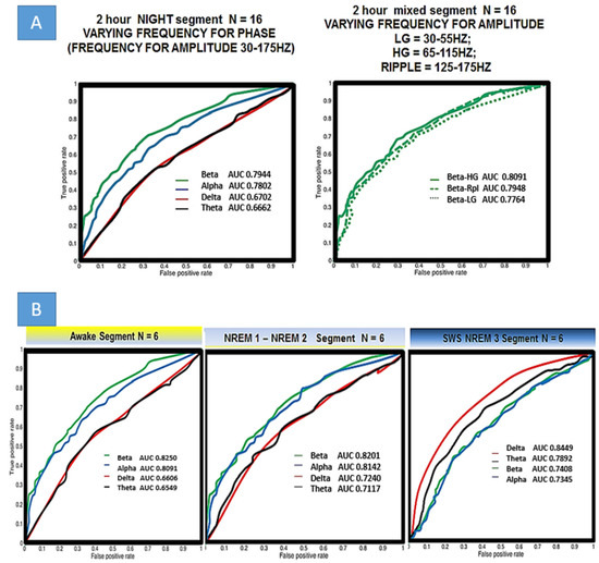 Seeming that elevations in PAC strongly correlate with epileptogenic electrodes, receiver operator curves (ROC, which itself is a reflection of sensitivity and specificity) were generated using linear step equivalent to varying threshold values for PAC in a range of <0,10> STD (normalized as in Figure 4) to generate the ROC plots (Figure 6A,B). True positives, defined as the electrodes which were grouped above the PAC threshold that also were deemed SOZ by epileptologists, were plotted vs. false positives, defined as the number of non SOZ electrodes grouped above PAC threshold. The quality of classification was assessed using area under the receiver operator curve (AUROC). The first ROC in Figure 6A assesses relevance for localization of all of the Berger bands within the wide modulating band (but holding the modulated band constant from 30–175 Hz) used for PAC analysis in Figure 2, Figure 4 and Figure 5. There is a clear difference in this scheme when looking across the entire 2 h segment. Beta modulating low-gamma (30–60 Hz), high-gamma (60–100 Hz), and ripple (100–175 Hz) PAC values resulted in the highest AUC and thus best discriminated SOZ from non-SOZ which in these ten patients was 0.7944. Comparing to AUCs of all patients with the paired t-test, there is a statistical difference for means in beta-GammaRipple and alpha-GammaRipple vs. delta-GammaRipple, and beta-GammaRipple and alpha-GammaRipple vs. theta-GammaRipple in terms of discriminating SOZ from nonSOZ (p < 0.05). However, there was not a statistical difference of AUC means between beta-GammaRipple versus alpha-GammaRipple and theta-GammaRipple compared to delta-GammaRipple in these ten patients across an entire 2 h night segment of mixed behavioral states (p > 0.05). Focusing on the right plot of Figure 6A, holding beta and varying Low-Gamma, High-Gamma, and Ripple, there is no statistical difference in AUCs’ means between the groups. This analysis was carried out for all other modulating bands (delta, theta, and alpha) and held true for all. In Figure 6B, six patients who had fully scored sleep segments were analyzed in the same manner but taking equal size segments of awake, N1-N2, and SWS/N3. The same pattern holds in awake and N1/N2 as is seen in Figure 6A but not in N3. In N3 delta modulation of wide bands of high frequency activity becomes most relevant in discriminating SOZ from non SOZ with AUC 0.8489 significantly different (p < 0.05) when compared to other bands.