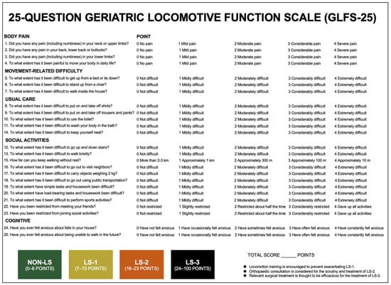- Seichi, A.; Hoshino, Y.; Doi, T.; Akai, M.; Tobimatsu, Y.; Iwaya, T. Development of a screening tool for risk of locomotive syndrome in the elderly: The 25-question Geriatric Locomotive Function Scale. J. Orthop. Sci. 2012, 17, 163–172. [Google Scholar] [CrossRef] [PubMed]