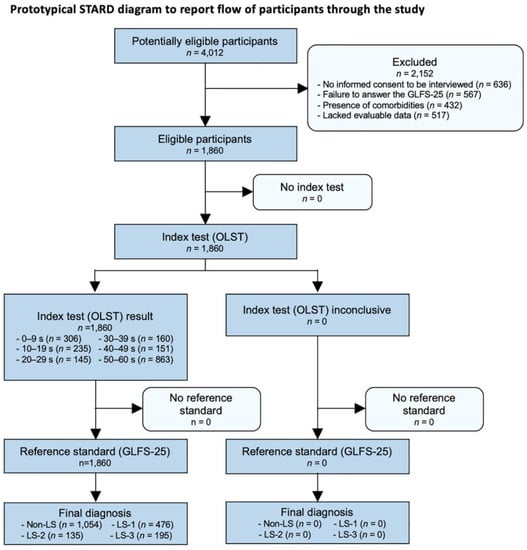 - Bossuyt, P.M.; Reitsma, J.B.; Bruns, D.E.; Gatsonis, C.A.; Glasziou, P.P.; Irwig, L.; Lijmer, J.G.; Moher, D.; Rennie, D.; de Vet, H.C.W.; et al. STARD 2015: An updated list of essential items for reporting diagnostic accuracy studies. BMJ 2015, 28, 351. [Google Scholar]