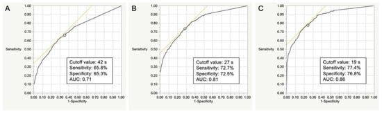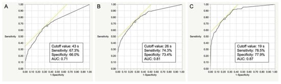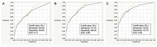 | Study | Subject (Number of Subjects) | Body Mass Index (kg/m2) | Cut-off Time (s) | Sensitivity (%) | Specificity (%) | AUC |