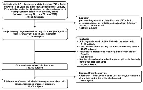 Kim, J.; Han, C.; Lee, M.-S.; Jeong, H.-G.; Kim, J.-J.; Kim, S.-H. Associations between Pharmacological Treatment Patterns during the Initial Treatment Period and the Relapse or Recurrence of Anxiety Disorders: A Nationwide Retrospective Cohort Study. Life 2023, 13, 1197. https://doi.org/10.3390/life13051197