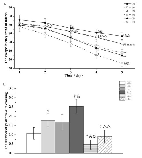 Trend of the escape latency (A) and the number of platform crossings (B) of the mice in the MWM test. Note: * represents p < 0.05 and ** represents p < 0.01 compared with the CNG; # represents p < 0.05 and ## represents p < 0.01 compared with the ENG; & represents p < 0.05 and && represents p < 0.01 compared with the CAG; ΔΔ represents p < 0.01 compared with the EAG; @ represents p < 0.05 compared with the CSG.