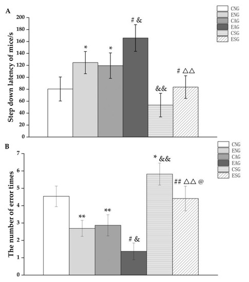 Step-down latency (A) and number of errors (B) in the step-down test. Note: * represents p < 0.05 and ** represents p < 0.01 compared with the CNG; # represents p < 0.05 and ## represents p < 0.01 compared with the ENG; & represents p < 0.05 and && represents p < 0.01 compared with the CAG; ΔΔ represents p < 0.01 compared with the EAG; @ represents p < 0.05 compared with the CSG.