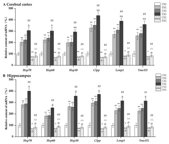 Relative mRNA levels of key proteins regulating the UPRmt in the cerebral cortex and hippocampus. (A) Relative content in cerebral cortex. (B) Relative content in hippocampus. Note: * represents p < 0.05 and ** represents p < 0.01 compared with the CNG; ## represents p < 0.01 compared with the ENG; & represents p < 0.05 and && represents p < 0.01 compared with the CAG; ΔΔ represents p < 0.01 compared with the EAG; @ represents p < 0.05 compared with the CSG.