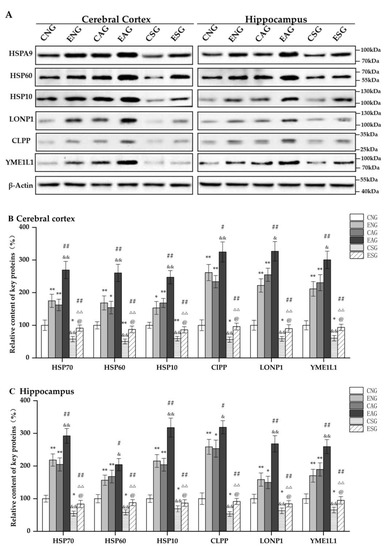 Relative content of key proteins regulating the UPRmt in the cerebral cortex and hippocampus. (A) Western blots of key proteins regulating the UPRmt in the cerebral cortex and hippocampus. (B) Relative content in cerebral cortex. (C) Relative content in hippocampus. Note: * represents p < 0.05 and ** represents p < 0.01 compared with the CNG; # represents p < 0.05 and ## represents p < 0.01 compared with the ENG; & represents p < 0.05 and && represents p < 0.01 compared with the CAG; ΔΔ represents p < 0.01 compared with the EAG; @ represents p < 0.05 compared with the CSG.