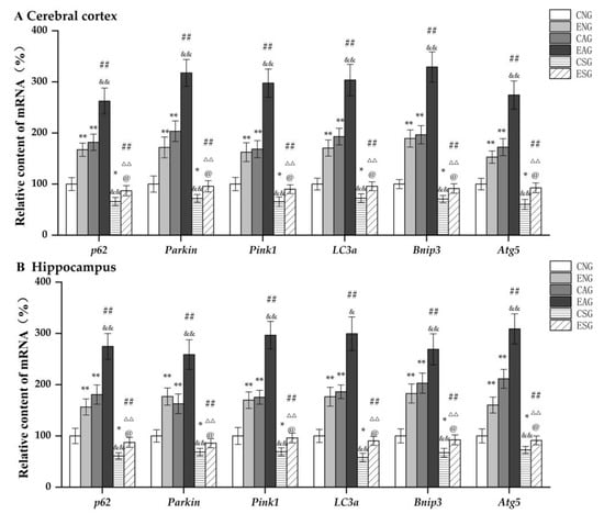 Relative mRNA levels of key mitochondrial autophagy regulators in the cerebral cortex and hippocampus. (A) Relative content in cerebral cortex. (B) Relative content in hippocampus. Note: * represents p < 0.05 and ** represents p < 0.01 compared with the CNG; ## represents p < 0.01 compared with the ENG; & represents p < 0.05 and && represents p < 0.01 compared with the CAG; ΔΔ represents p < 0.01 compared with the EAG; @ represents p < 0.05 compared with the CSG.
