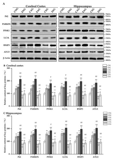 Relative protein content of key mitochondrial autophagy regulators in the cerebral cortex and hippocampus. (A) Western blots of key proteins regulating mitochondrial autophagy in the cerebral cortex and hippocampus. (B) Relative content in cerebral cortex. (C) Relative content in hippocampus. Note: ** represents p < 0.01 compared with the CNG; # represents p < 0.05 and ## represents p < 0.01 compared with the ENG; && represents p < 0.01 compared with the CAG; ΔΔ represents p < 0.01 compared with the EAG; @ represents p < 0.05 compared with the CSG.