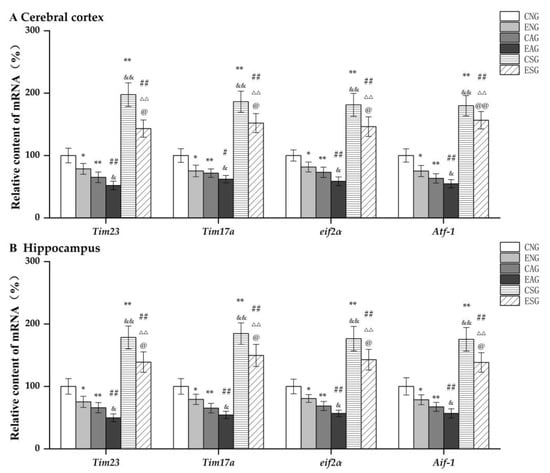 We first measured the mRNA levels of Tim23, Tim17A, eif2α, and Atf-1 in the cerebral cortexes and hippocampi of mice in each group using QF-PCR. As shown in Figure 7, in the cerebral cortex and hippocampus, compared with the CNG, the mRNA levels of Tim23, Tim17A, eif2α, and Atf-1 in the ENG and CAG were significantly decreased, while those in the CSG were significantly increased. Compared with the ENG, the mRNA levels of Tim23, Tim17A, eif2α, and Atf-1 in the EAG were significantly decreased, while those in the ESG were significantly increased. Compared with the CAG, the mRNA levels of Tim23, Tim17A, eif2α, and Atf-1 were significantly decreased in the EAG, while they were significantly increased in the CSG. Compared with the EAG, the mRNA levels of Tim23, Tim17A, eif2α, and Atf-1 were significantly increased in the ESG. Compared with the CSG, the mRNA levels of Tim23, Tim17A, eif2α, and Atf-1 were significantly decreased in the ESG.