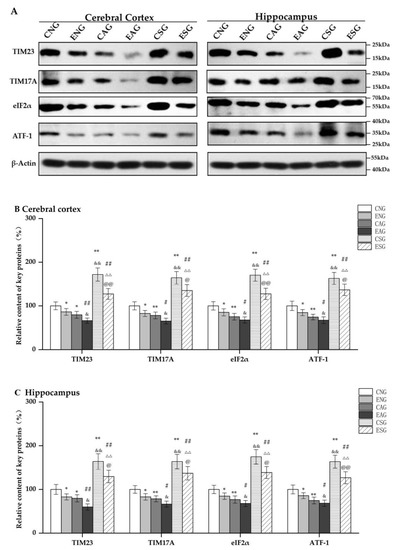 Subsequently, we measured the protein levels of TIM23, TIM17A, EIF2α, and ATF-1 in the cerebral cortexes and hippocampi of mice in each group through Western blot. As shown in Figure 8, in the cerebral cortex and hippocampus, compared with the CNG, the protein levels of TIM23, TIM17A, EIF2α, and ATF-1 in the ENG and CAG were significantly decreased, while those in the CSG were significantly increased. Compared with the ENG, the protein levels of TIM23, TIM17A, EIF2α, and ATF-1 in the EAG were significantly decreased, while those in the ESG were significantly increased. Compared with the CAG, the protein levels of TIM23, TIM17A, EIF2α, and ATF-1 were significantly decreased in the EAG, while they were significantly increased in the CSG. Compared with the EAG, the protein levels of TIM23, TIM17A, EIF2α, and ATF-1 in the ESG were significantly increased. Compared with the CSG, the protein levels of TIM23, TIM17A, EIF2α, and ATF-1 in the ESG were significantly decreased.