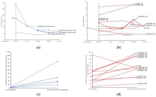 Individual courses of lyso-Gb3 in males (a) compared to females (b) and enzyme activity before and during treatment with migalastat in males (c) compared to females (d). Red = female, blue = male. Continuous lines represent the mean value. [late-onset] = late onset phenotype of Fabry disease; [classic] = classic phenotype of Fabry disease. Baseline = “treatment start”.