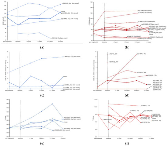 During the observational period, between the individual baseline or earliest follow-up CMR under migalastat treatment and the individual latest follow-up, there were no significant changes in LVMi, IVS, PWT or LVEDV in the total cohort or in the subgroups of patients with LVH at baseline or male/female patients. Median values of CMR parameters at baseline and the individual latest follow-up are displayed in Table 2. The individual analysis of LVMi (Figure 2) shows an overall stable course of Fabry cardiomyopathy in most, predominantly female, patients. However, some patients showed a trend towards the progression of LVMi despite therapy with migalastat, such as two male (one presenting with LGE, one without) patients with the late onset mutation c.713G>A p.(S238N) aged 58 and 60 years, respectively, and a 70-year-old female with the classic mutation c.581C>T p.(T194I), who also presented with progressive LGE, despite being the only patient receiving co-medication with acetylsalicylic acid (ASA). In contrast, a stabilization of Fabry cardiomyopathy was observed in a 69-year-old female with the same classic mutation c.581C>T p.(T194I). Another 46-year-old female patient carrying the c.902G>A p.(R301Q) late-onset mutation with LGE already at baseline showed a mild increase in LVMi. No correlation could be found between the change in α-Gal A activity and the course of LVMi.