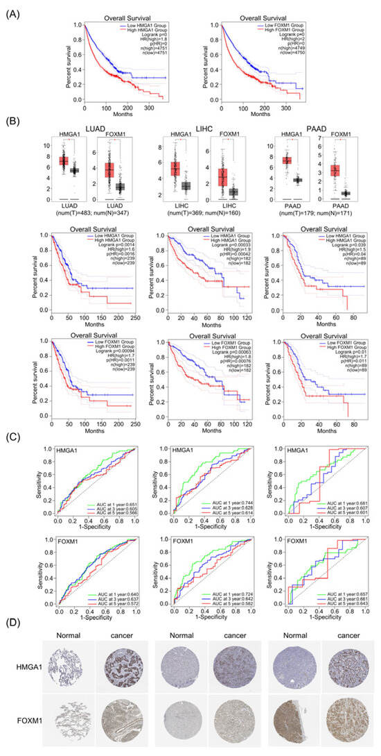 The following supporting information can be downloaded at: https://www.mdpi.com/article/10.3390/life13051225/s1, Figure S1: The expression and correlation of HMGA1 and FOXM1 in pan-cancer; Figure S2: The relationship between HMGA1 and FOXM1 in the clinicopathological features of LUAD, LIHC and PAAD; Table S1: The expression of HMGA1 and FOXM1 and survival significance in various types of cancer; Table S2: Co-regulatory genes in LUAD, LIHC and PAAD cancers of HMGA1 and FOXM1 overexpressed mRNA samples.