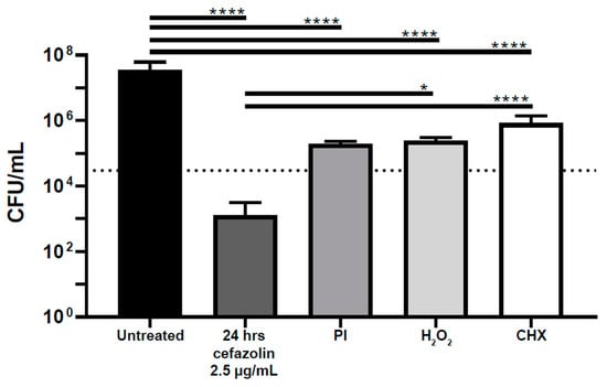 Antiseptics are not bactericidal against S. aureus biofilm. The amount of S. aureus biofilm after treatment was quantified and compared. PI—povidone-iodine at 0.3%; CHX—chlorhexidine at 0.05%; and H2O2—hydrogen peroxide at 1.5%; . . . . . = 3 log reduction; * = p < 0.01; **** = p < 0.0001.