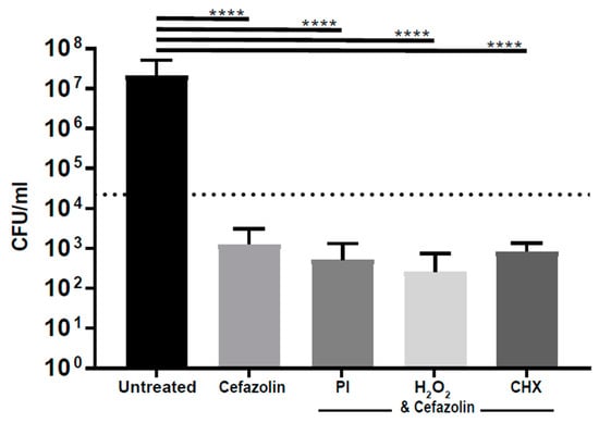 Antiseptics in combination with cefazolin reduces biofilm but does not display synergy. The amount of S. aureus present after treatment with cefazolin in combination with antiseptics was quantified and compared. CHX—chlorhexidine at 0.05%; PI—povidone-iodine at 0.3%; H2O2—hydrogen peroxide at 1.5%; and cefazolin = 2.5 μg/mL; . . . . . = 3 log reduction; **** p < 0.0001.