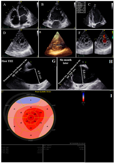 Two- and three-dimensional transthoracic echocardiographic views of case #2: (A–C); left ventricular apical four and two-chamber views. (D,E); Apical SAX view, illustrating hypertrabeculated apical portions in addition to deep intertrabecular recesses and reduced left ventricular ejection fraction (LVEF = 16%, calculated by Simpson’s method). (F); Color Doppler echocardiography, showing evidence of direct blood flow from the ventricular cavity into deep intertrabecular recesses. (G,H); Transesophageal echocardiographic findings of baseline (left) and 6 months later (right); follow-up test showed fast-growing aortic root that reached 5.8 cm. (I); Speckle tracking echocardiographic findings, compatible with myocardial performance impairment plus relative apical sparing (GLS = −10.4%).