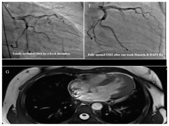 Two-dimensional transthoracic echocardiographic views of case #3. (A); Left ventricular apical SAX view, illustrating hypertrabeculated apical portions in addition to deep intertrabecular recesses. (B); Color Doppler echocardiography, showing evidence of direct blood flow from the ventricular cavity into deep intertrabecular recesses. (C); Dilated aortic proximal ascending aorta. (D); Speckle tracking echocardiographic findings, compatible with myocardial performance impairment of all segments with GLS = −14.3%. (E,F); Coronary angiography showing on arrival and 2-week post-treatment results. (G); Cardiac magnetic resonance imaging, illustrating prominent non-compaction in left ventricular apical and lateral wall.
