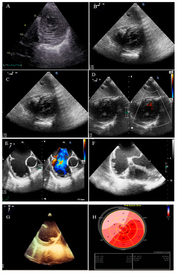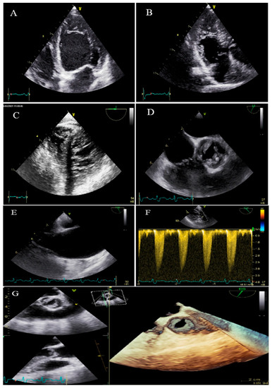 Two-dimensional transthoracic echocardiographic views of case #7. (A,B); Biventricular non-compaction in apical four and three-chamber views. (C–F); Transesophageal echocardiography views, illustrating biventricular non-compaction in apical regions in addition to a thick, bicuspid aortic valve with restricted cusps motion (C,D), dilated ascending aorta (E), and increased transvalvular gradient in deep gastric view with a peak velocity of 3 m/s, in favor of moderate aortic stenosis (F). (G); Full volume three-dimensional transthoracic echocardiography, showing bicuspid, thick, and stenotic aortic valve (AVA by MPR = 1.4 cm2).