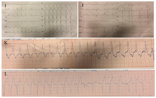 Two-dimensional transthoracic echocardiographic views of case #4, (A); Biventricular apical SAX view, (B,C); Transesophageal gastric views, illustrating hypertrabeculated apical portions in addition to deep intertrabecular recesses. (D); Color Doppler echocardiography, showing evidence of direct blood flow from the ventricular cavity into deep intertrabecular recesses. (E–G); Two- and three-dimensional mid-transesophageal echocardiographic views, showing a large ostium primum type of atrial septal defect with left to right shunt. (H); Speckle tracking echocardiographic findings, compatible with myocardial performance impairment, mild in apical to severe in basal segments, and GLS = −10.9%. (I–L); Twelve-lead electrocardiography and a couple of tracings at different times, showing complete heart block and sustained runs of wide QRS tachycardia.