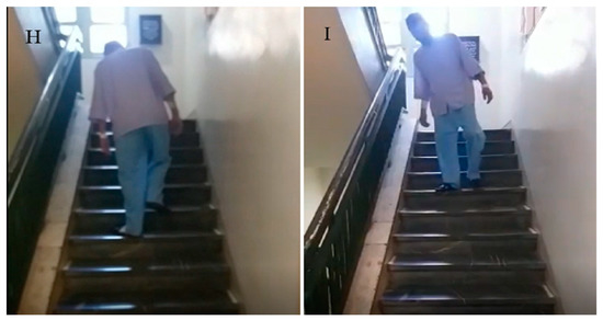 Two-dimensional transthoracic echocardiographic views of case #6. (A,B); Biventricular non-compaction in apical four-chamber and SAX views. (C,D); Thick, bicuspid aortic valve with diastolic closure doming; PLAX zoomed-out and zoomed-in views. (E); Diastolic closure and systolic opening in SAX view. (F,G); Speckle tracking echocardiography, illustrating severe myocardial performance impairment in all segments with GLS of −3.3%. (H,I); Patient’s difficulty in going up and down the stairs because of weakness in the proximal muscles, when he was asked not to use the stair railing.