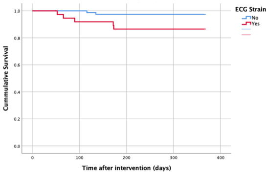 Along with the ECG strain pattern, aortic valve mean gradient at baseline (p = 0.056), the baseline EuroSCORE (p = 0.035), and the history of atrial fibrillation (p = 0.008) were inserted in a multivariate model which found that ECG strain is an independent predictor of all-cause mortality at 1 year after TAVI [Exp(B): 12.2, 95% Confidence Intervals (CI): 1.4–101.9, p = 0.02]. In the same multivariate model, the patient’s age, concomitant coronary artery disease, diabetes mellitus, and major periprocedural vascular events were assessed as potential confounders, but were not found to affect the significant association between ECG strain and all-cause mortality at 1 year after TAVI.