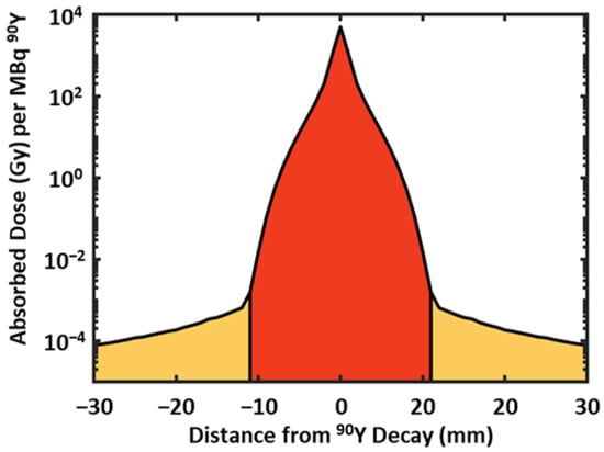 90Y is a pure beta emitter with a mean beta range of 2–4 mm, with >99.9% of the overall absorbed dose deposited within 11 mm (Figure 1) [3]. There exists a low likelihood of the generation of bremsstrahlung photons that can lead to dose deposition beyond the beta particle range; however, its contribution to the overall tissue dose is extremely low. The beta particle range has negative and positive implications for tumor and normal tissue dose deposition. A negative consequence of the beta particle range is the potential for the under-dosing of tumor margins, even in ideal cases of tumors that are uniformly perfused with microspheres. The resultant mean tumor dose is therefore lower than initially planned, especially in smaller tumors (diameters < 2 cm). Conversely, the beta particle range has the potential benefit of irradiating volumes with a low microsphere uptake, as in the case of tissues just beyond the tumor margins or hypo-perfused regions within tumors.