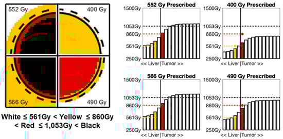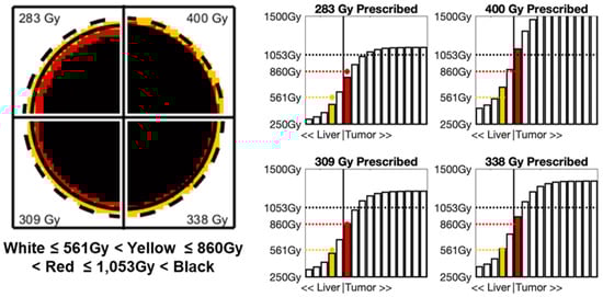 The nominal case defined to estimate doses needed for CPN, based on the previously published clinical data [19,20], was a single hyperperfused tumor of = 2.5 cm and = 0.33 (i.e., = 3:1) treated with the Standard dosimetry dose for the perfused volume of = 400 Gy. These conditions correspond to normal liver and tumor voxel activity concentrations of 25.1 MBq/mL and 8.4 MBq/mL, respectively. Using Equations (3)–(6), the Voxel doses necessary to achieve CPN are = 1053 Gy for the mean tumor dose, = 860 Gy for the dose at the tumor boundary, and = 561 Gy for the dose 2 mm beyond the tumor edge.
