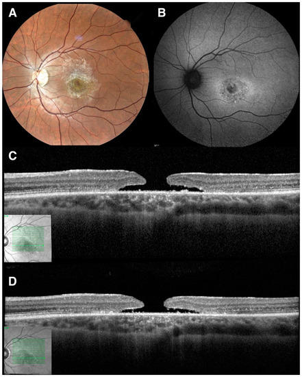 - Rossi, S.; Testa, F.; Attanasio, M.; Orrico, A.; De Benedictis, A.; Della Corte, M.; Simonelli, F. Subretinal Fibrosis in Stargardt’s Disease with Fundus Flavimaculatus and ABCA4 Gene Mutation. Case Rep. Ophthalmol. 2012, 3, 410–417. [Google Scholar] [CrossRef] [PubMed]