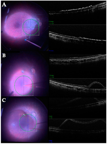 The use of optical coherence tomography (OCT) integrated with the operating microscope significantly helps to perform subretinal injections [72]. A representative case of a subretinal injection of Voretigene Neparvovec-rzyl is shown in Figure 2.