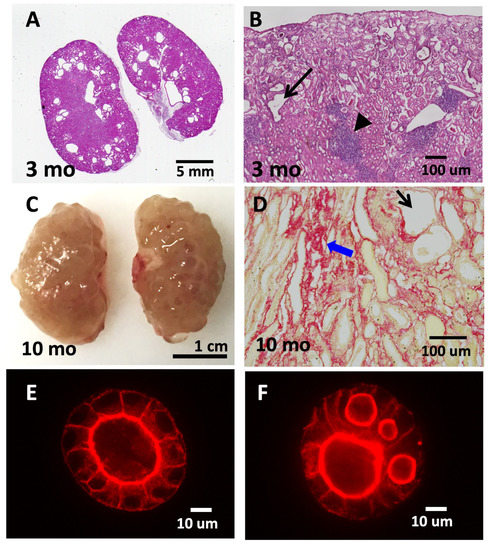 Tns1-KO mice develop features of cystic kidney disease. Tns1-KO kidneys isolated from 3-month-old (A,B) or 10-month-old (C,D) mice were processed for H&E staining (A,B), Sirius Red staining (D), or general morphology (C), showing dilated tubules (black arrows), interstitial infiltration (arrowhead), fibrosis (blue arrows), and cystic kidneys. Representative images of Tns1 WT (E) or KO (F) MDCK in 3D Matrigel culture for 5 days and stained for actin.