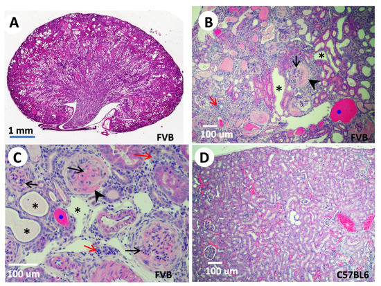 Tns2-KO FVB mice develop features of glomerulonephritis. Kidneys isolated from 9-week-old (A) or 6-week-old (B,C) Tns2-KO FBV mice, generated in the laboratory using Tns2-KO embryonic stem cells from the Knockout Mouse Programme (www.mousephenotype.org, accessed on 10 October 2015), were processed and stained with H&E, showing mesangial proliferation (black arrows), segmental glomerulosclerosis (arrowhead), tubular dilatation (asterisk), cast (blue dot), and interstitial infiltration (red arrow). These defects are mouse-strain-dependent and are not developed in the kidneys of Tns2-KO C57BL6 mice, even at 2 years of age (D).