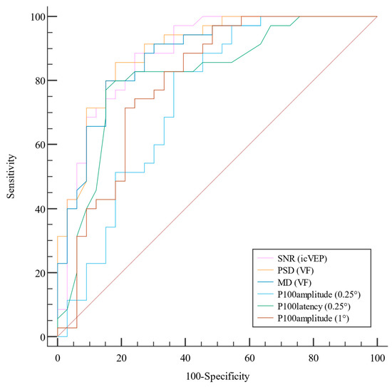 As Figure 1 and Table 3 show, the AUC of PSD was the largest (0.895), followed by that of the icVEP SNR (0.887), the MD (0.877), the P100 latency of 0.25° checks (0.815), the P100 amplitude of 1° checks (0.798), the P100 amplitude of 0.25° checks (0.742), and the P100 latency of 1° checks (0.582). The specificity of the SNR (88.57%) was the highest of all the parameters, while the MD and P100 latency (0.25° checks) displayed higher sensitivities (both 84.85%) than the other parameters. The PSD had the highest diagnostic accuracy (0.838), icVEP SNR had the highest positive predictive value (PPV, 86.2%), and MD had the highest negative predictive value (NPV, 84.8%).