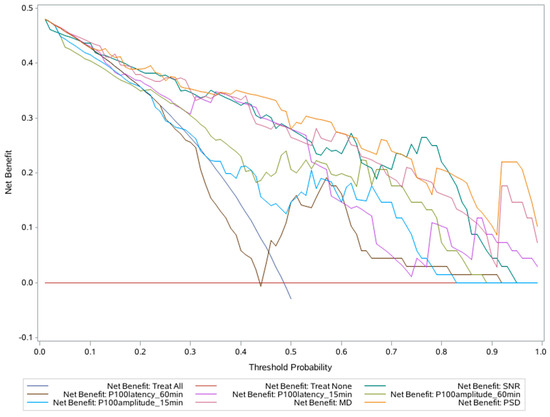 A DCA was performed to assess the clinical utility of the above three tests. As the net benefit (NB) curves (Figure 2) show, two lines represent two extremes: the diagonal line in dark blue represents all subjects with POAG (treat all), while the horizontal red line represents none of the subjects with POAG (treat none: non-POAG). A parameter was deemed the best indicator if it showed a maximum NB (ordinate) value at any given threshold (abscissa). Therefore, the three curves of PSD, SNR, and MD were the farthest from the two extreme curves, indicating that the VF and icVEP tests offer more clinical benefit value than the PVEP test.
